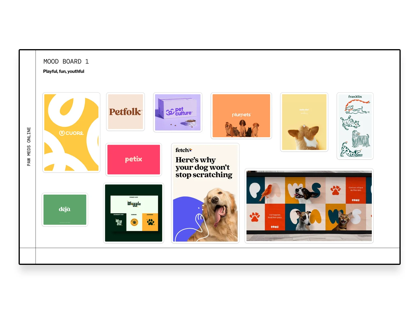 I started with a stakeholder discovery session to define scope, audience, and tone. From there, I audited competitors in the online pet medication space and shared a visual analysis of trends in type, colour, and tone.